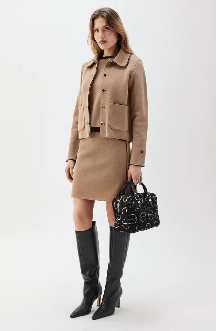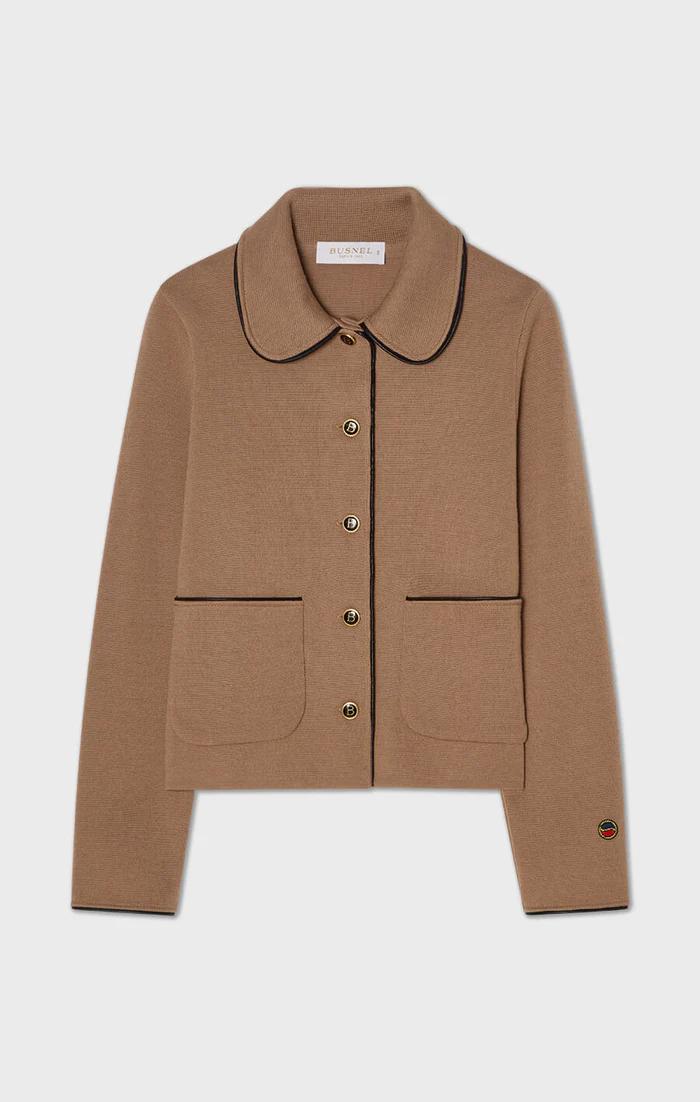 Maxine Piped Jacket er en strikket jakke laget i Frankrike, i ull av høy kvalitet. Denne korte jakken er detaljert med skinnlignende kantbånd gjennom hele jakkesløypen. Passformen er lett A-fôret, hoftelang, den har en avrundet krage, påsydde lommer og svarte emaljede B-knapper foran. Det er et overgangsplagg som kan brukes som blazer eller som ytterplagg.