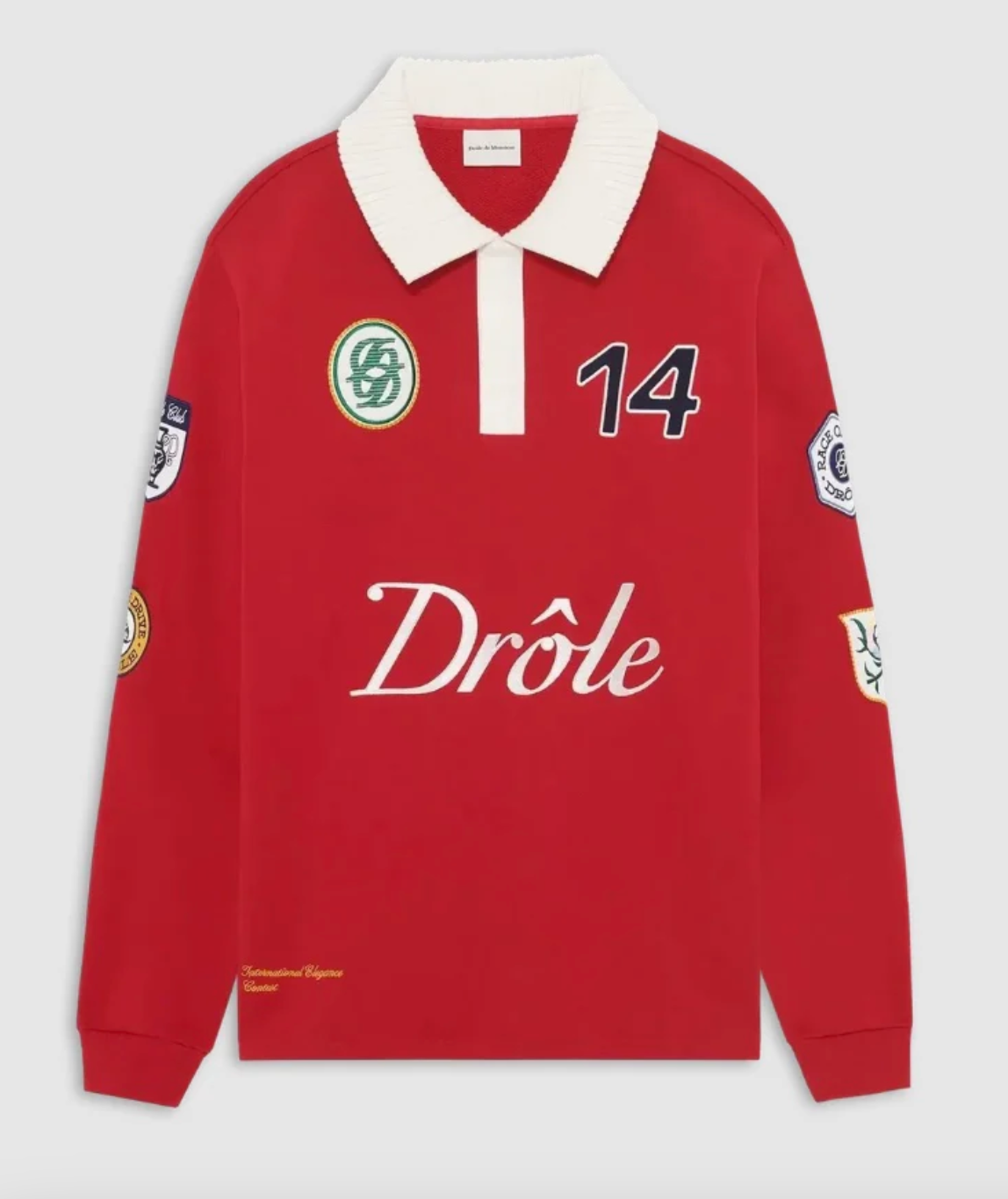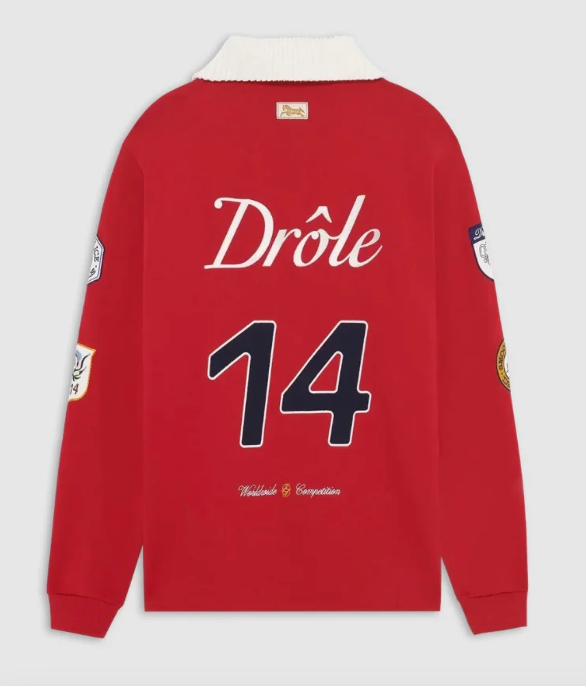 Denne røde langermede poloen i 100 % bomull er dekorert med lapper og et «Drôle»-broderi foran og bak. Den har en kontrasterende ribbet krage og knappestolpe samt ribbede mansjetter.