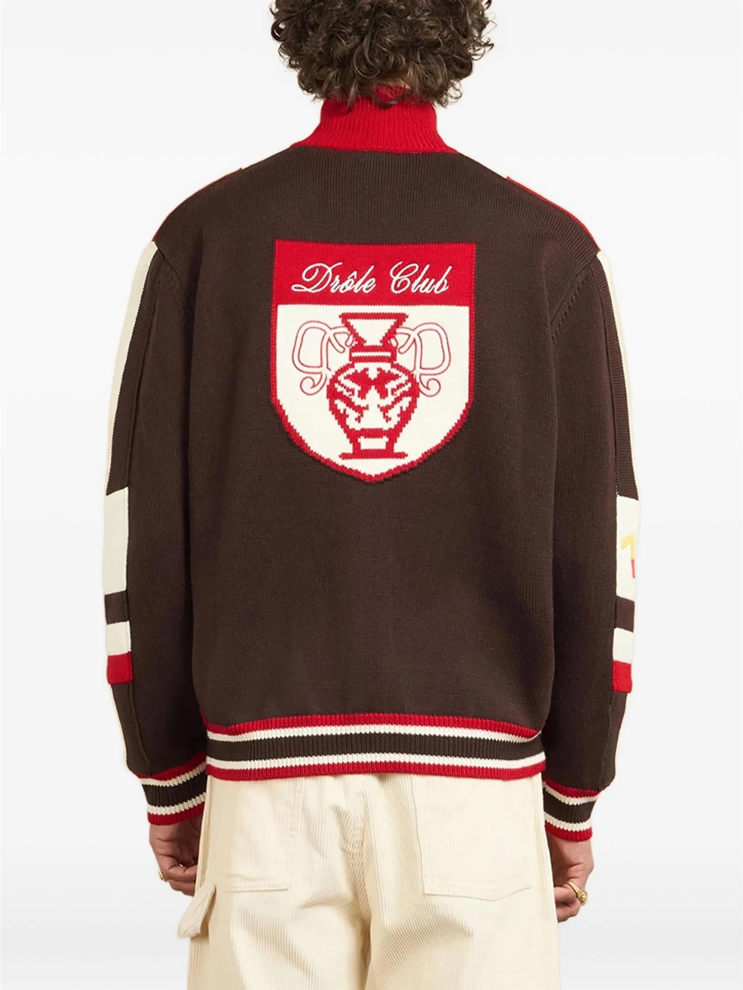 Den har ståkrage, lave ermehull, stripete paneler foran, trefargede striper på ermene, speilvendte 'D'- og Ski Competition-strikkledder på brystet, og en Drôle Club-slagord-jacquardstrikkledde lapp bak. Den har glidelåslukking og to lommer med glidelås foran, samt stripete ribbede mansjetter og fald.