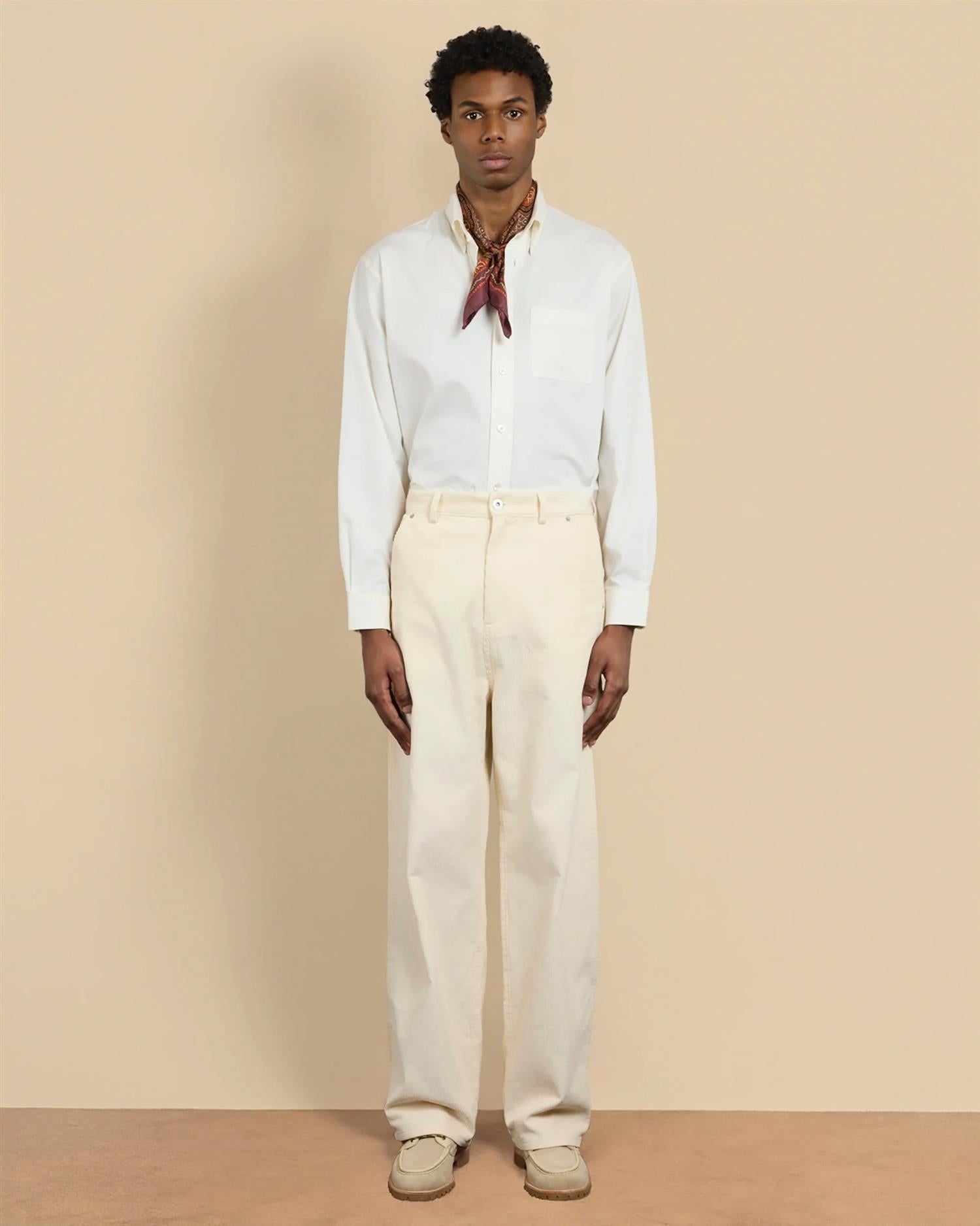 Disse kremfargede cordfløyelsbuksene er laget av 100 % bomull og kombinerer klassiske arbeidstøydetaljer med et unikt, moderne uttrykk.