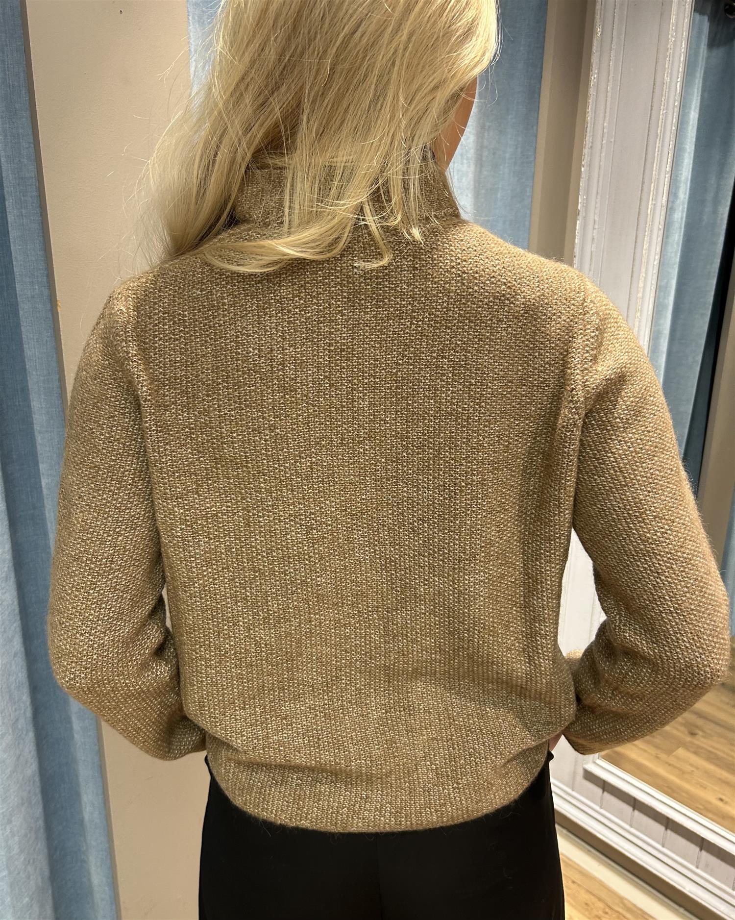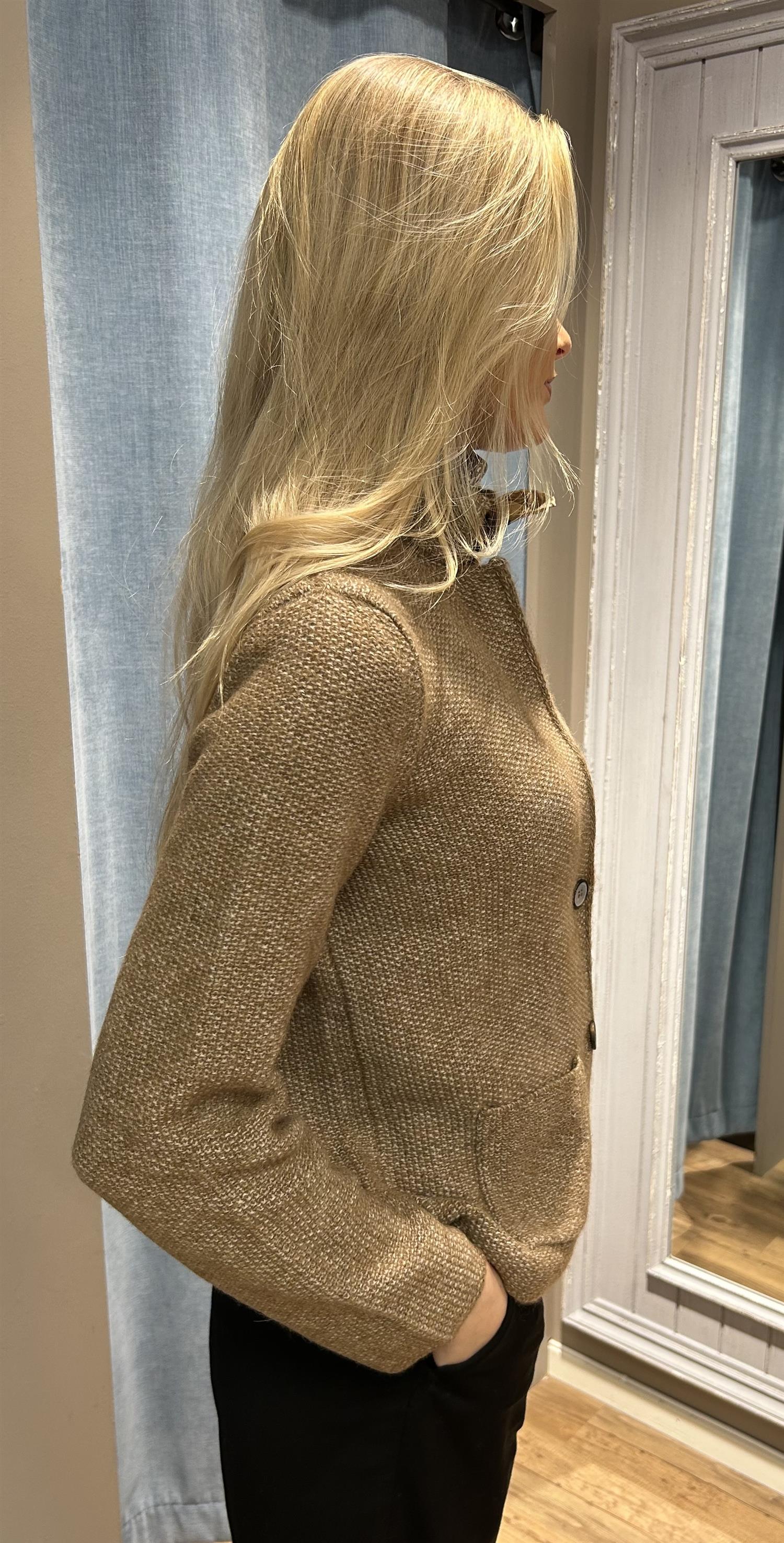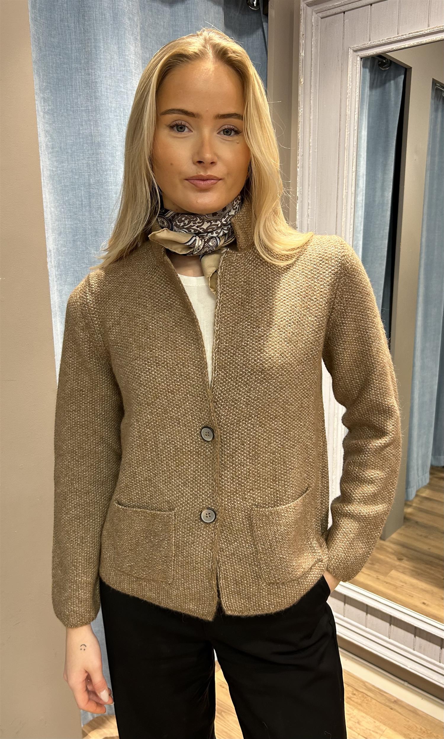 En strikket jakke med stående krage i en 3-lags alpakkablanding med lukking med to knapper og påsydde lommer. Riskornstrikken pynter opp denne klassiske damegarderoben, noe som gjør den perfekt for både kontor- og fritidsbruk.