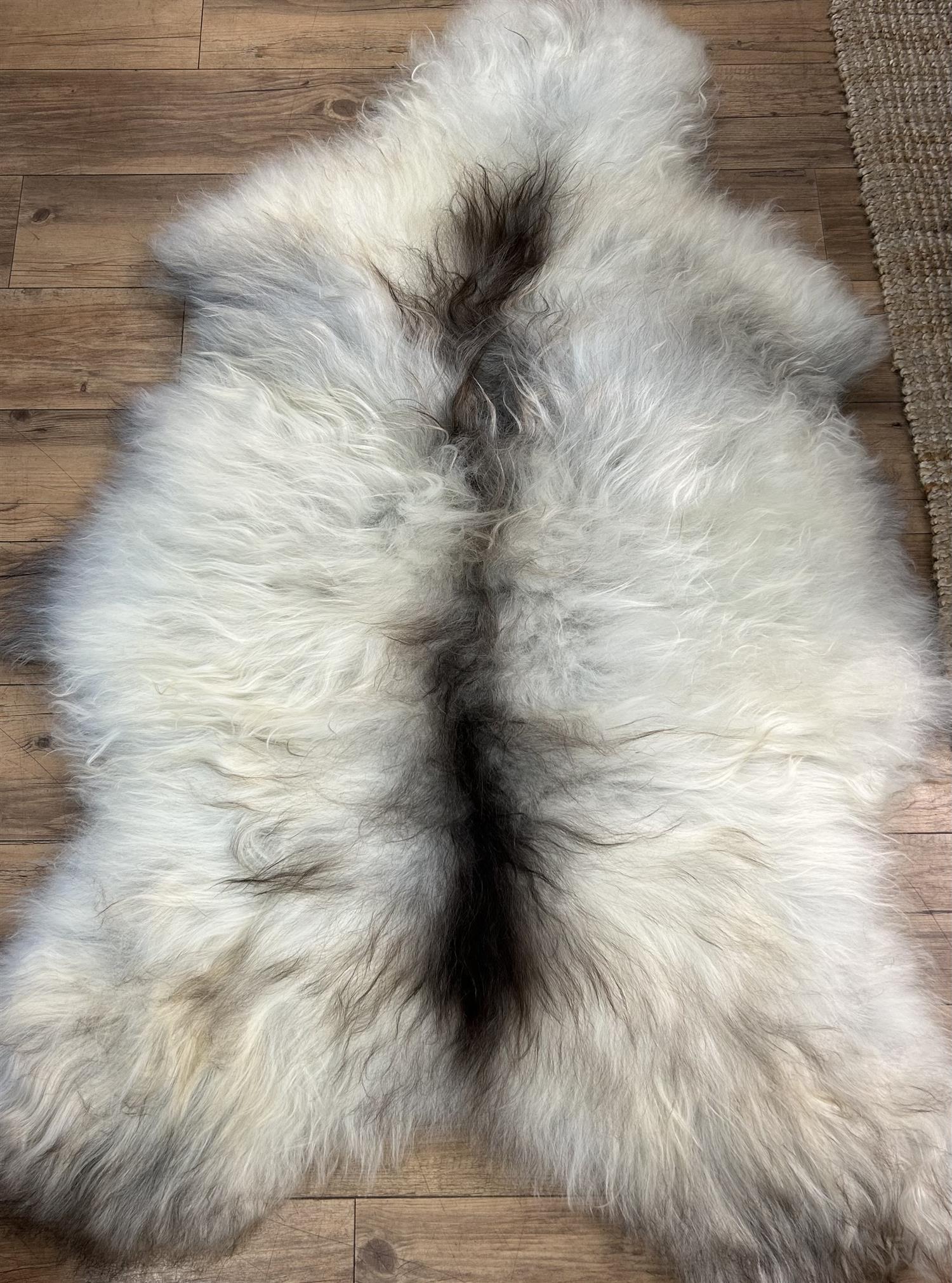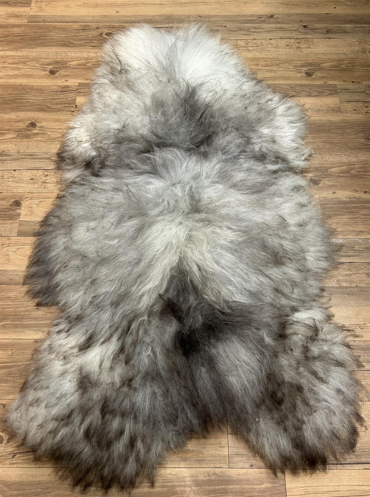 Saueskinn gråmelert natur spæl-sau. Disse varierer i fargen men er hovedsakelig går. Blandet med litt sort og litt brunt. Naturlig farge.