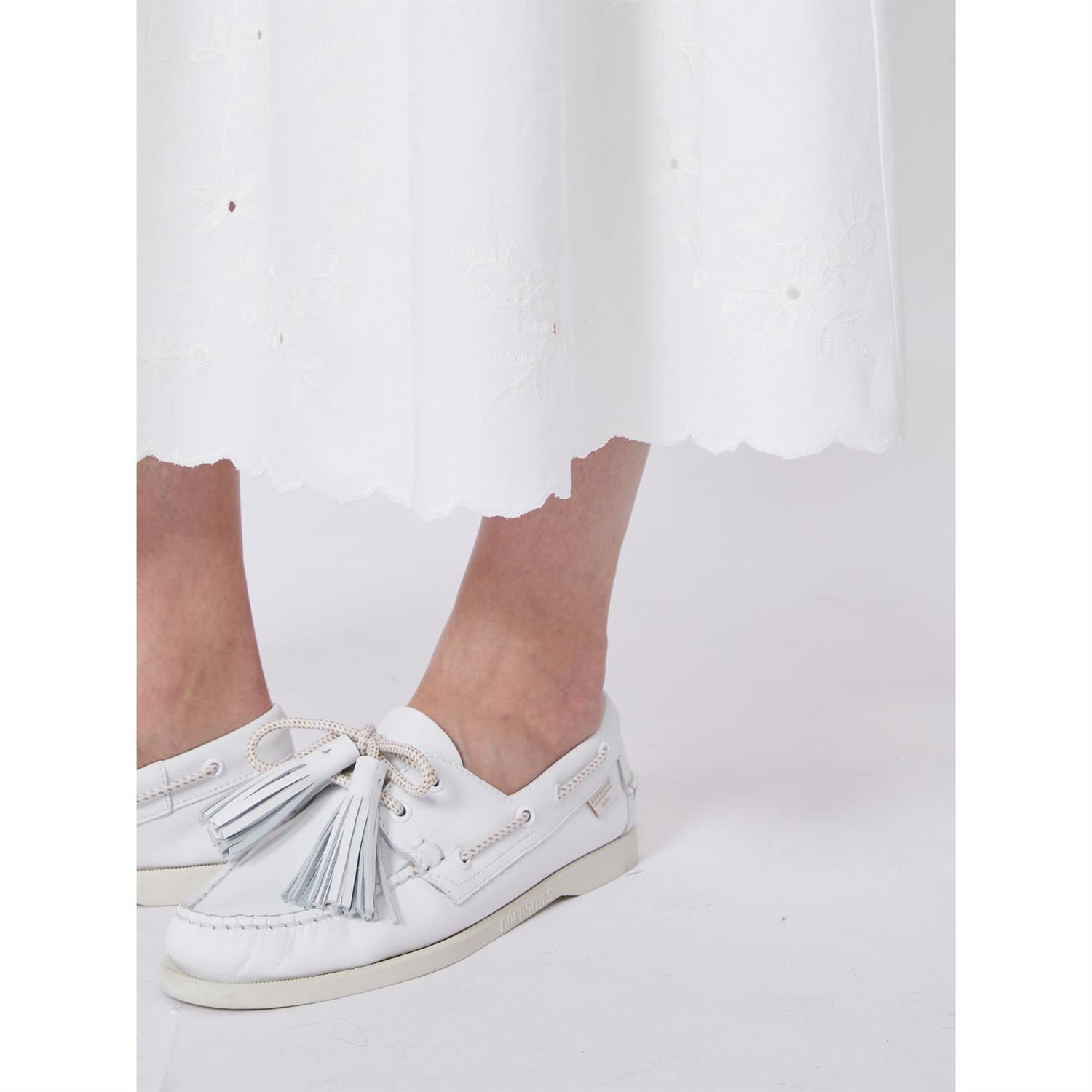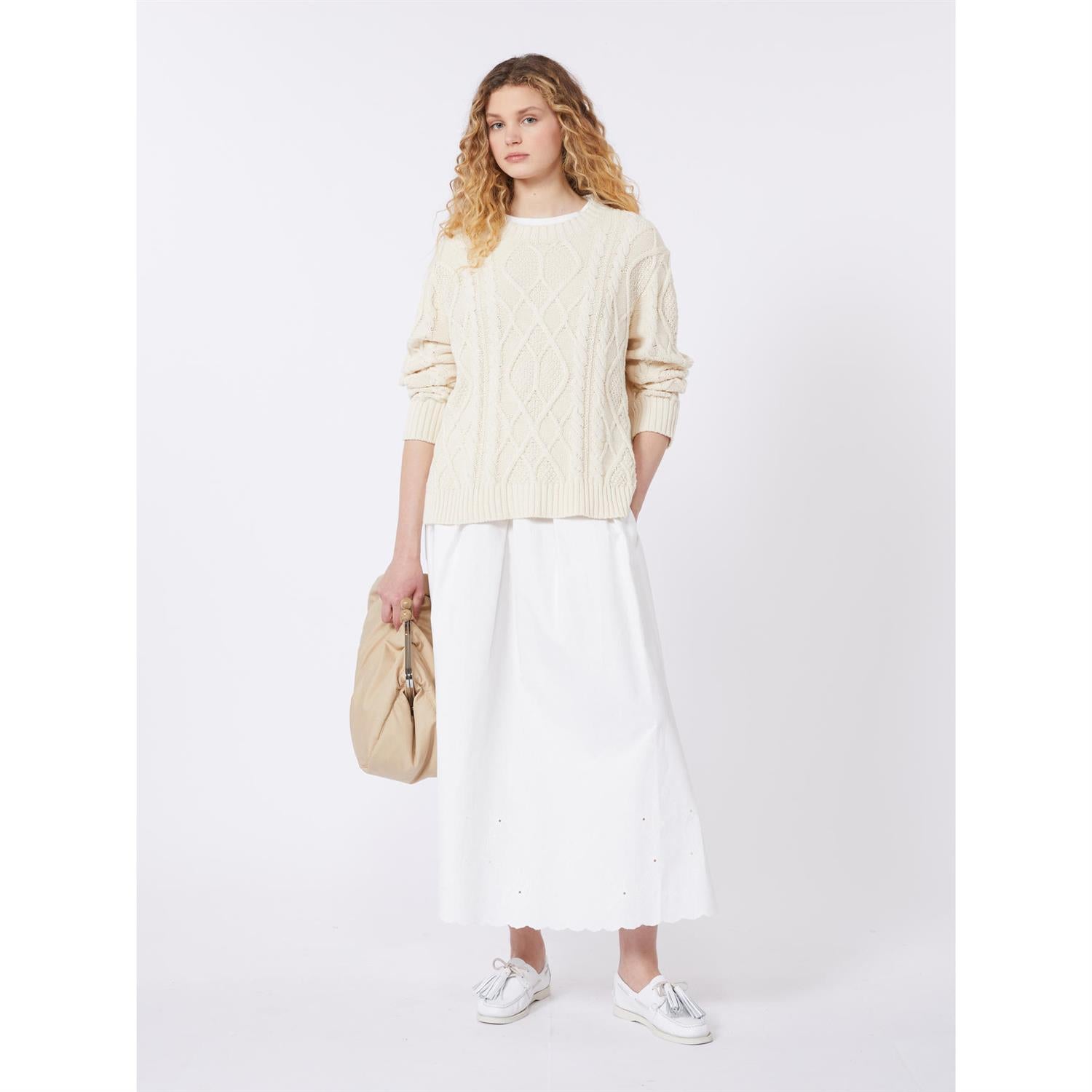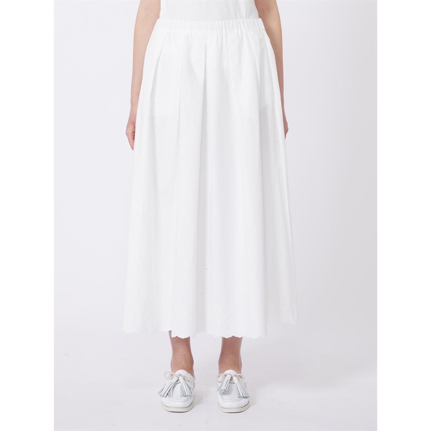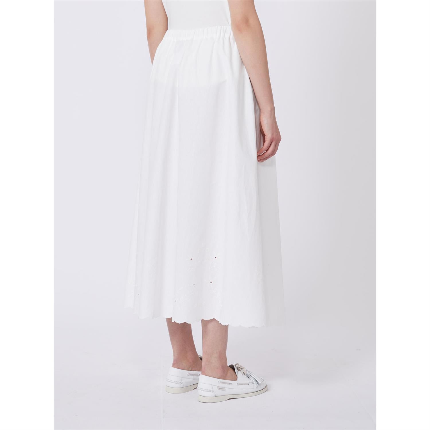 Long A-line skirt, embellished with eyelet embroidery on the hem and a scalloped edge.