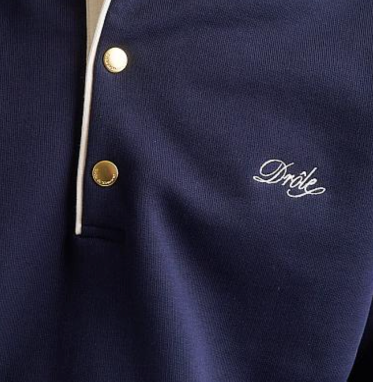 Polo Drôle Navy er en pologenser fra Drôle de Monsieur. Laget av 100% bommulsfrottéstoff, har pologenseren en krage med striper, og "Drôle" broderi på brystet. Genseren har en løs passform, knappelukning med graverte trykknapper, og ribbestrikket krage, ermer og kant.