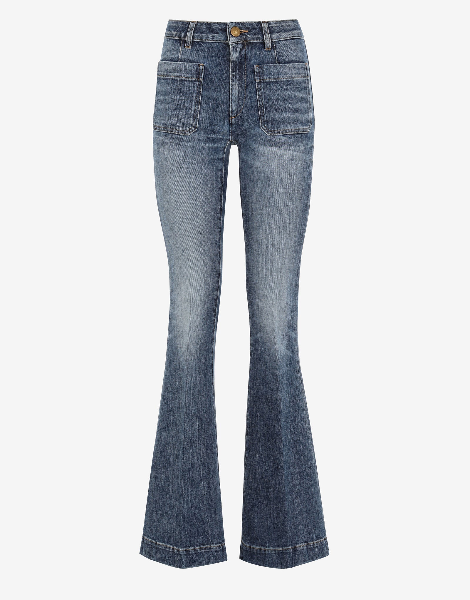 Delphine er dette merkets ikoniske denim, et tradisjonelt mønster brukt av kjendiser på 1970-tallet. Høylivet, utsvingt denim med fire påsydde lommer. Tilspent silhuett til knærne og lett utsvingt nederst med kremfarget logobroderi bak på linningen. Synlig knapp- og glidelåslukking.