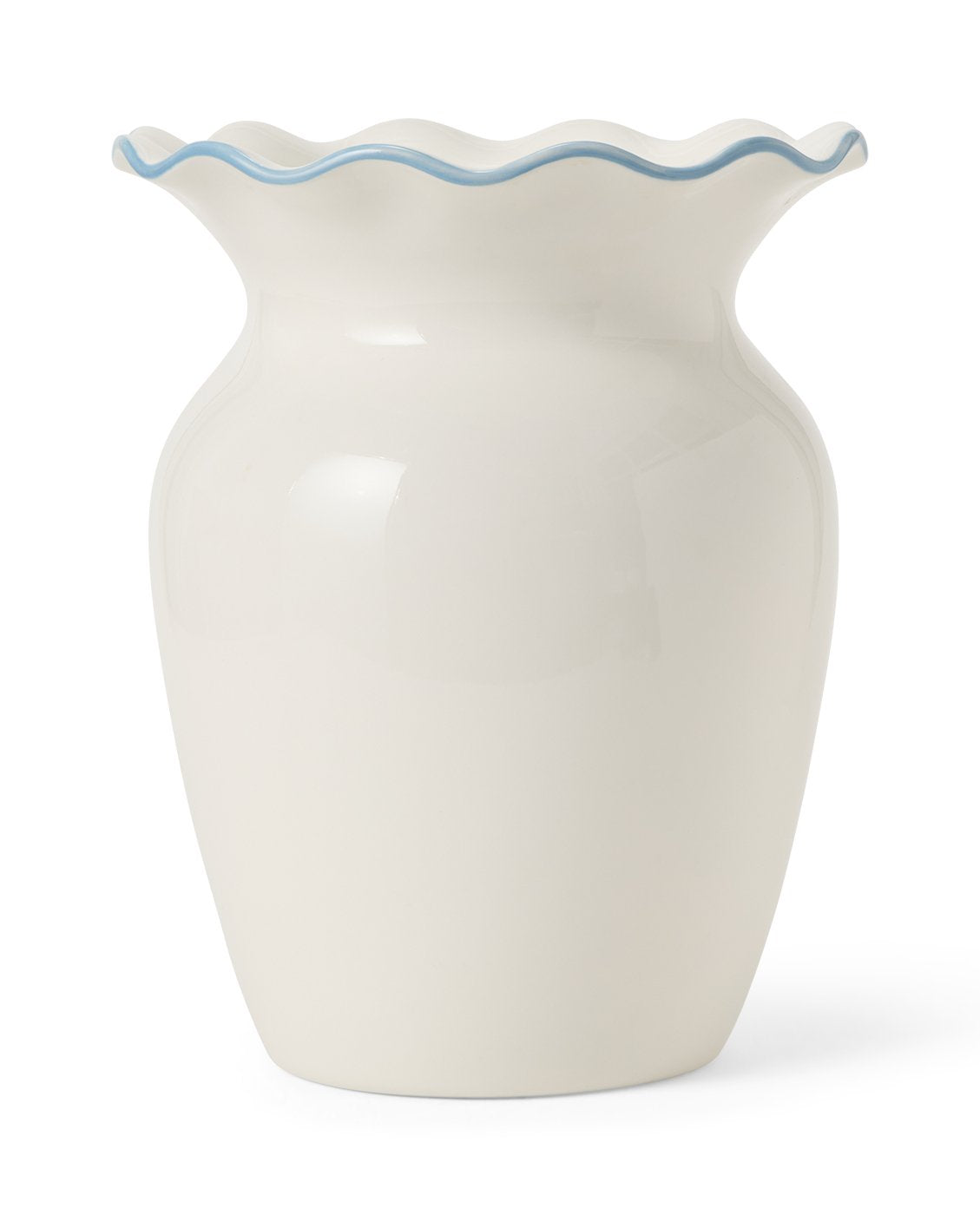 Denne elegante vasen i steintøy har en distinktiv bølget detalj rundt kantene, vakkert komplettert med håndmalte kanter i medium blå på toppen. Laget av høykvalitets steintøy med blank glasurfinish, tilbyr dette produktet i begrenset opplag eksepsjonell holdbarhet og tidløs eleganse. Det håndverksmessige arbeidet og den sofistikerte designen gjør den til et slående tillegg til hjemmedekorasjonen din, perfekt for å vise frem friske eller tørkede blomster. Kombiner med andre produkter fra samme serie for å skape et helhetlig og stilfullt uttrykk i hele hjemmet ditt.