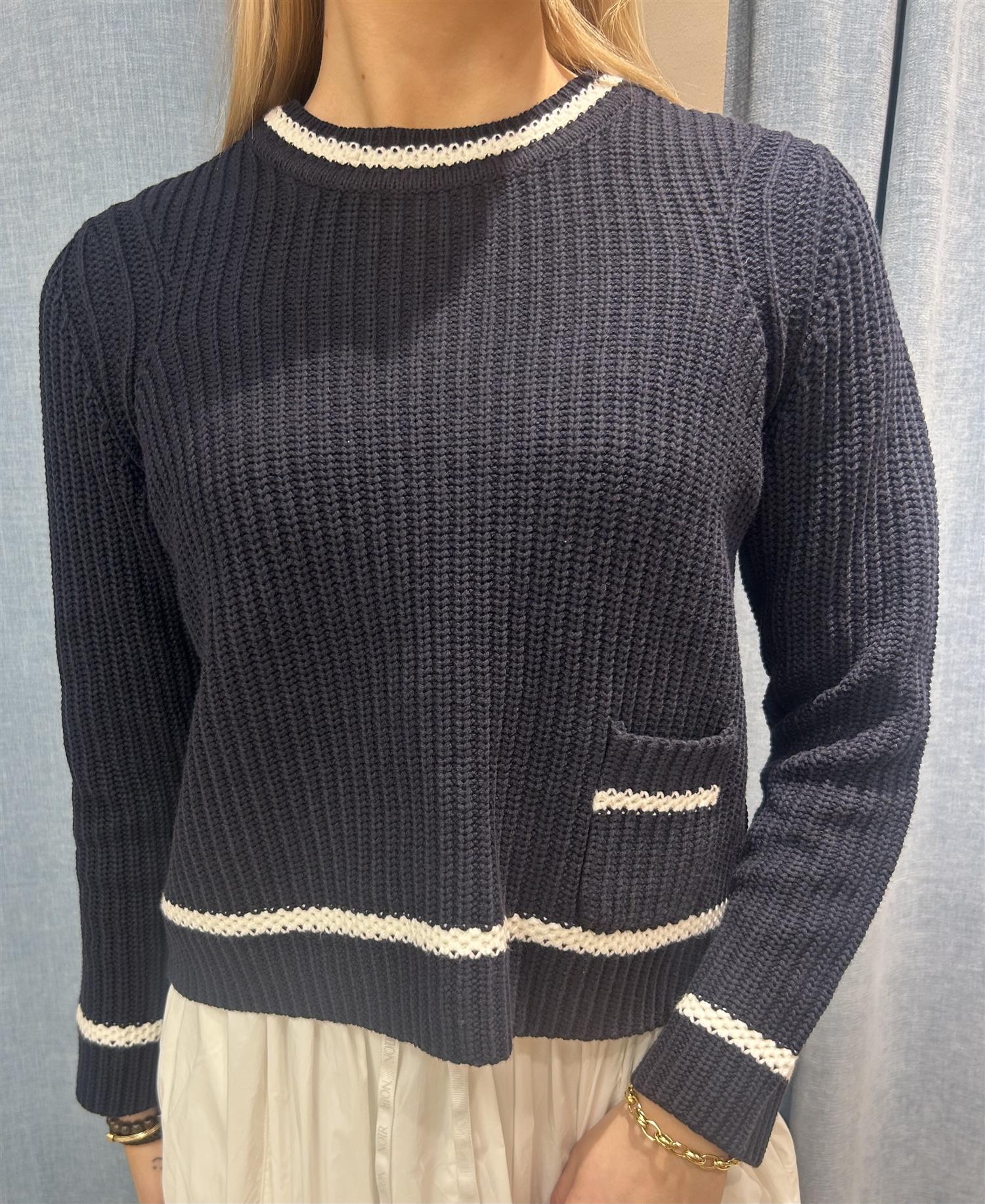 Maritim strikke genser med rund hals og en liten lomme foran.