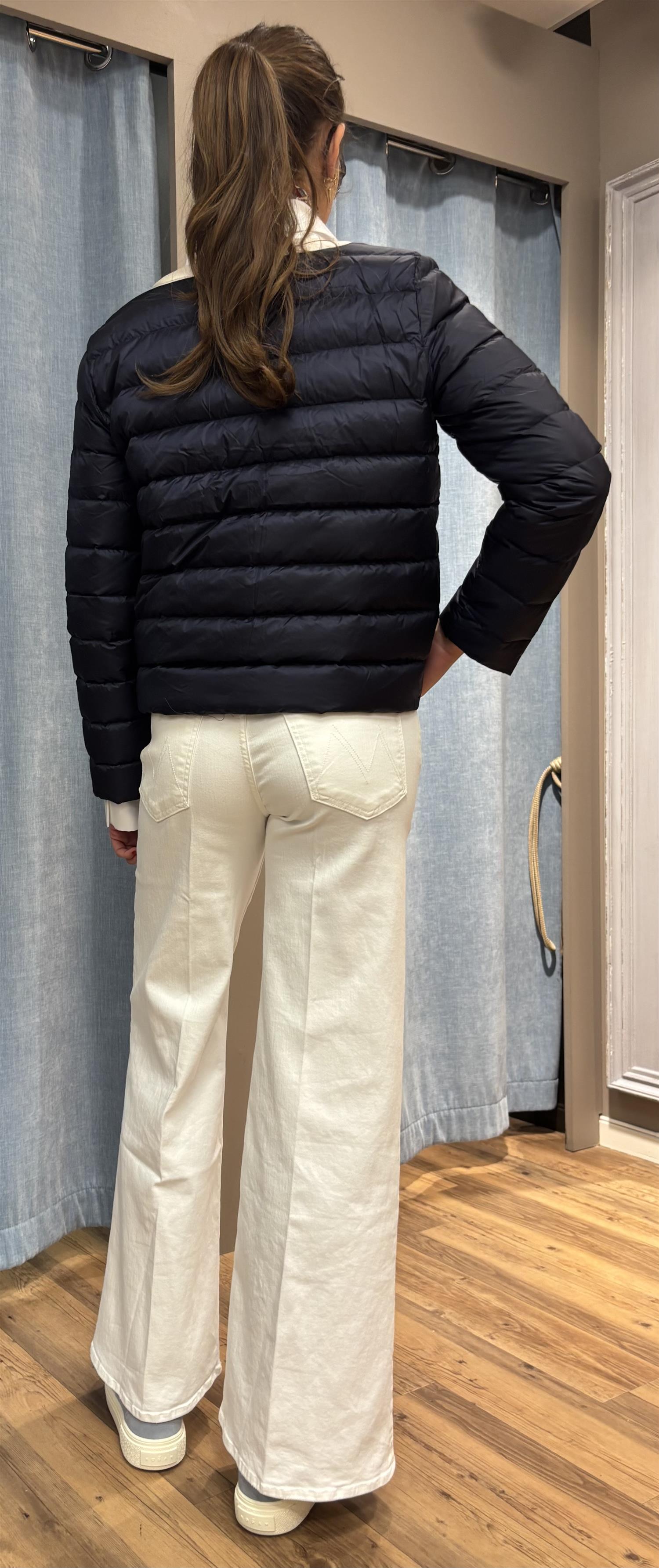Klassisk lett dunjakke fra Busnel, men denne gangen med en fin hvit kant rundt halsen og ned knappestolpen,