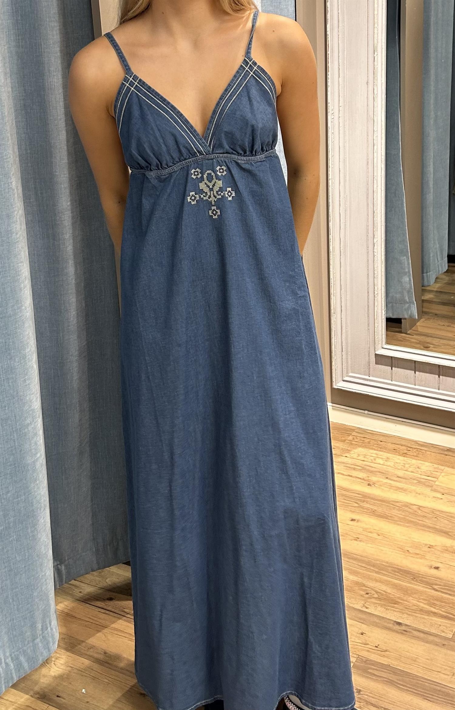 Lang denim kjole med justerbare stropper.