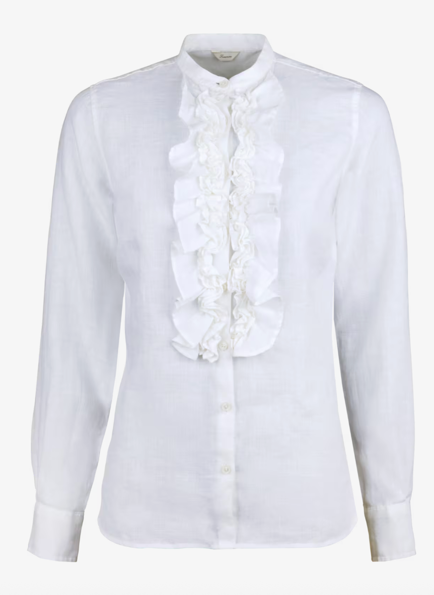 Klassisk modell i 100% lin med feminine volanger langs knappe stolpen. Denne blusen er laget av lin og har en feminin passform. Blusen har volanger foran, enkle mansjetter og en mandarinkrage.