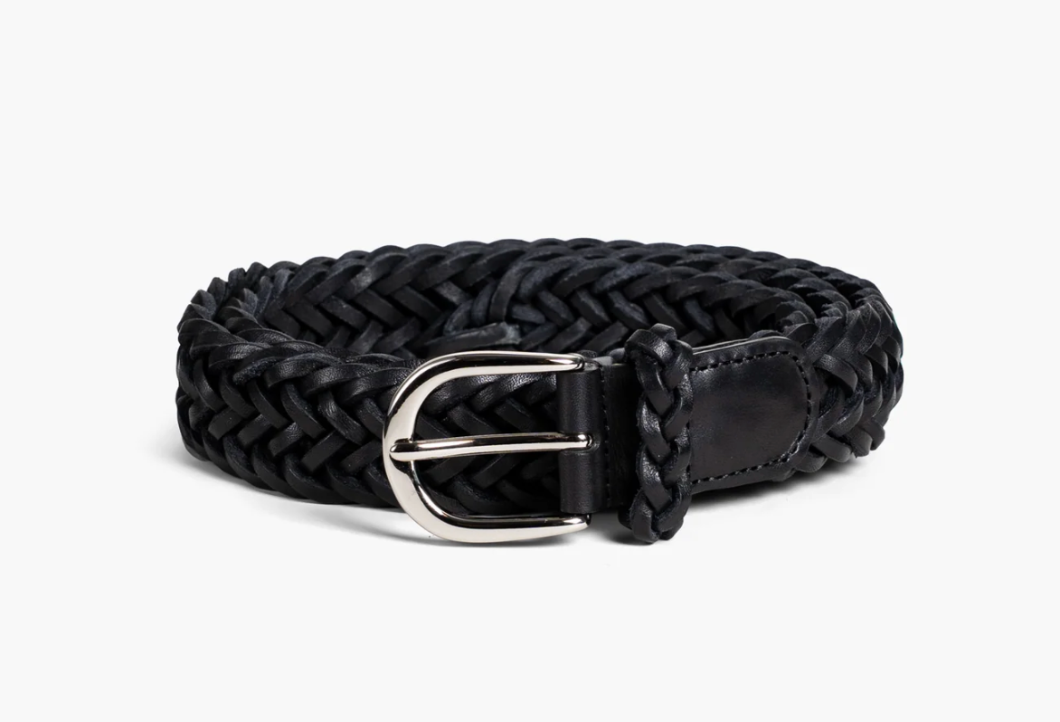 Klassisk flettet skinn belte med gull farget spenne. Belte er 3,8 cm bredt.
